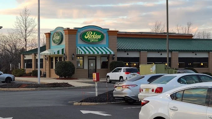 Located on a 55 in TV in the restaurant lobby. Perkins is a chain of over 400 restaurants and is well known in the area.