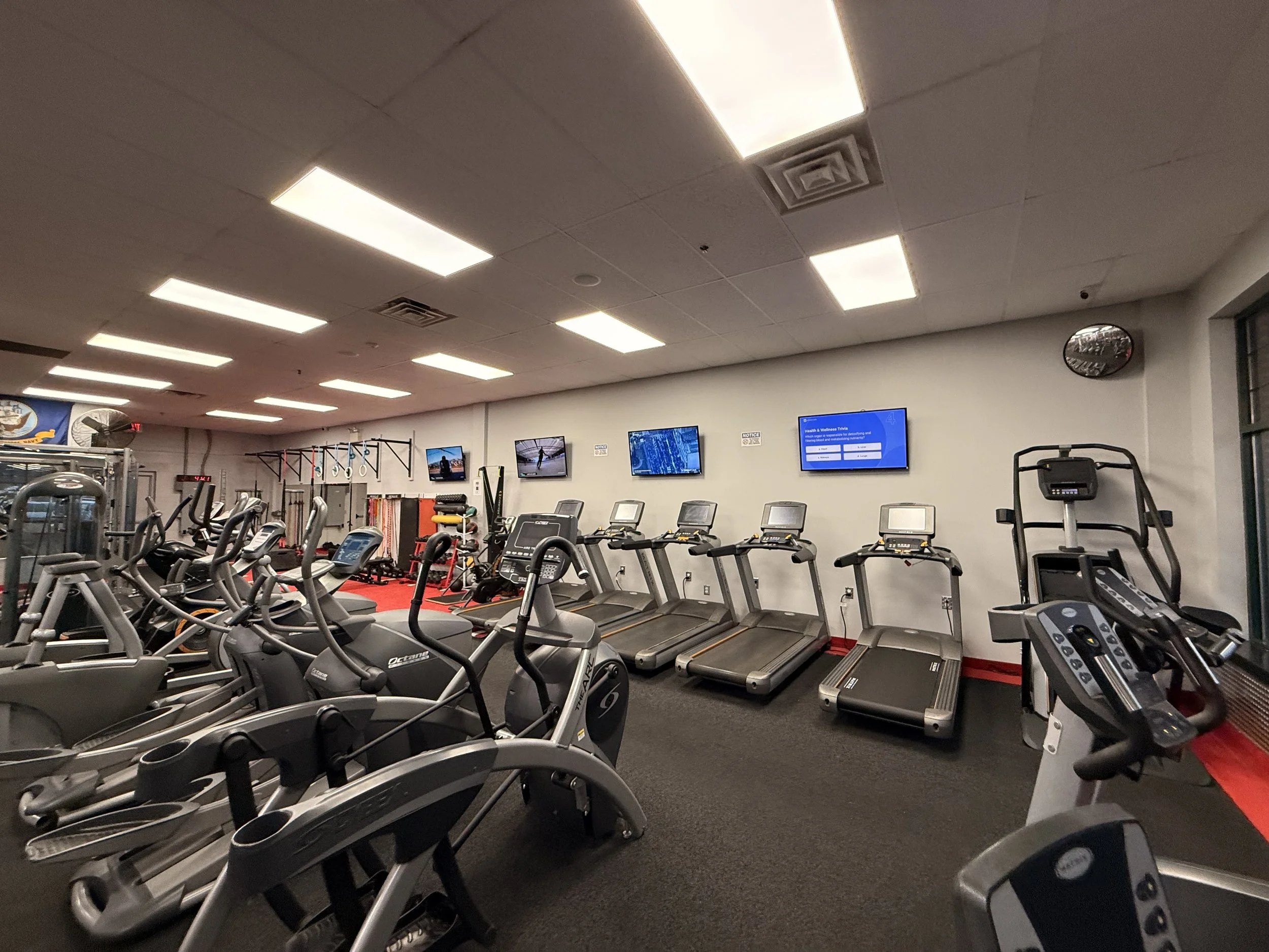 An all-inclusive fitness environment offering state of the art equipment. 2 screen are located above treadmills and general workout areas.