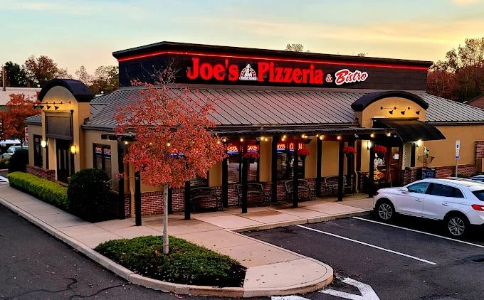 A 75 inch TV behind the counter in the restaurant lobby. Joe's has been awarded the best pizza for several years.